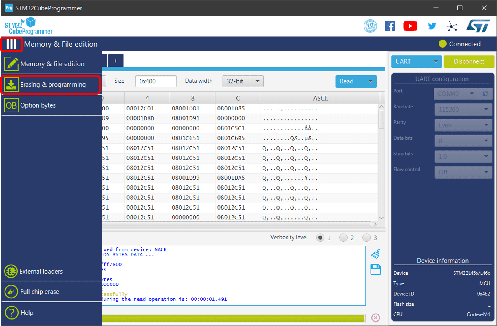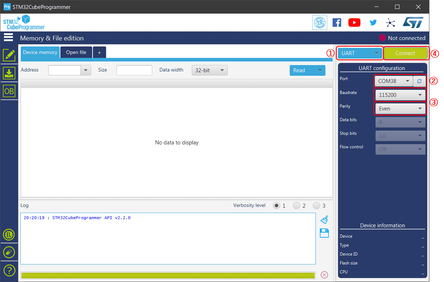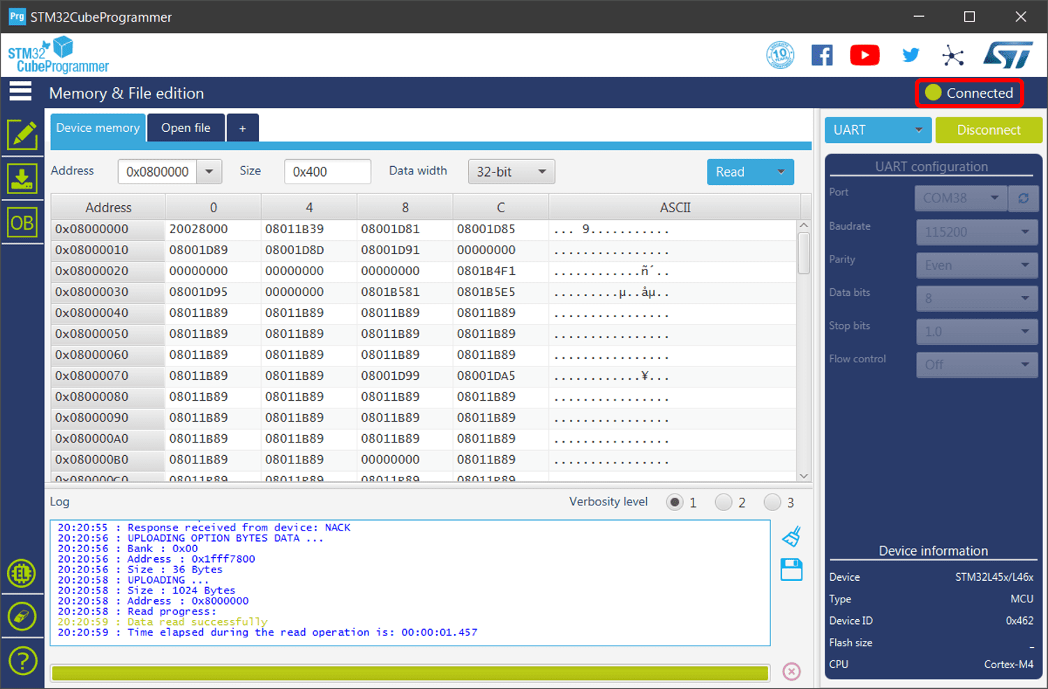 - Launch STM32CubeProg and connect it to the microcontroller of the product